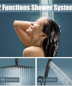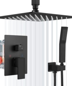 Ceiling Mount Shower System, 12 Inch Rain Shower Head with Handheld Spray High Pressure Shower Faucet Set Rough-in Valve and Shower Trim Included Bathroom Matte Black Square Knob