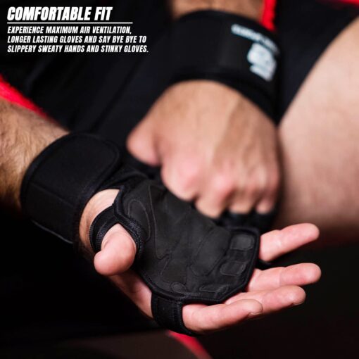 - OPEN HAND DESIGN FOR COMFORT – Experience maximum air ventilation and say bye bye to slippery sweaty hands and smelly, stinky gloves. Increase your work out gloves life span and reduce bad odors from old sweat wit the open hand air ventilation design.