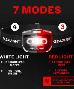 - VERSATILE DESIGN – Our premium headlamps feature a 45-degree adjustable head to direct light precisely where you need it. Choose from 7 different lighting modes, ranging from white strobe to red beam for safety