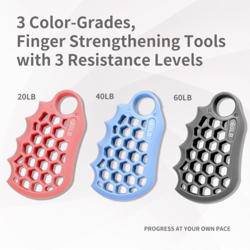 - [3 Stages of Grip Exercise]: A perfect set for anyone who wants to build up hand and finger strength, this hand exercises for grip strength set includes 3 color-coded resistance levels – pink (20 lb), blue (40 lb) and grey (60 lb) – so you can increase your strength and advance at your own pace.