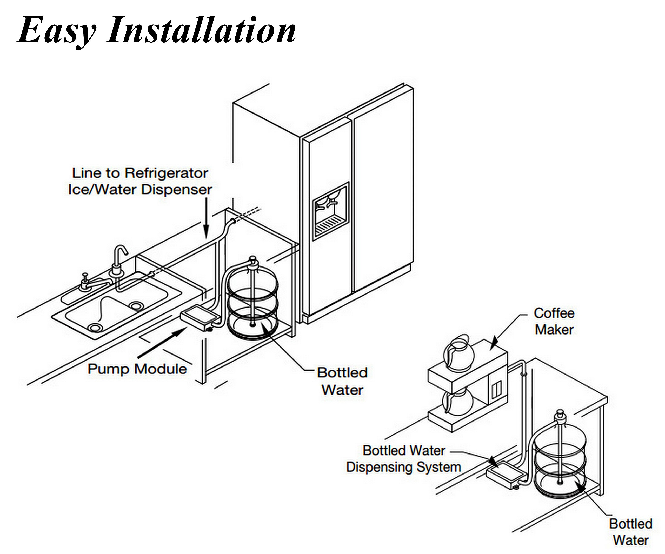 - 【Easy Installation】Assembled with 66in inlet pipe (1.8ft hard pipe in 5gal jug & 3.6ft hose connected to the pump) & 20ft outlet hose, the dispenser pump can be easily installed under counter. PS.Please installed the pump as close as possible to the machine for better pumping effect.