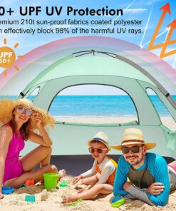 - UPF 50+ Protection & Excellent Ventilation: Our beach tent is made of premium 210t sun-proof material coated polyester, it can effectively block heat and 98% of the harmful UV rays. 3 super large roll up mesh windows increase airflow and reduce the temperature. It helps keep summer’s scorching heat away from your family and allows you to enjoy the oceanic breeze with a comfortable space.