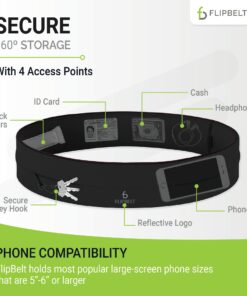 - MONEY & PHONE POUCH: The FlipBelt features 4 pocket openings to slip in all your must-have items, like cards, cash, and earphones, and it even has an internal key hook for added security. It’s bounce-free storage for your phone during your workout and is compatible with screens 5″–6″ and larger.