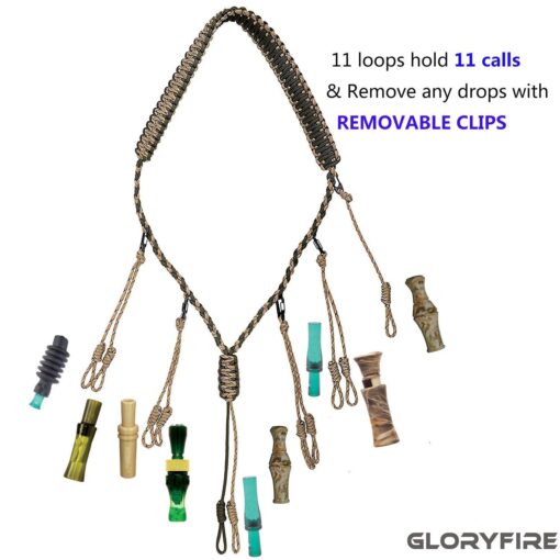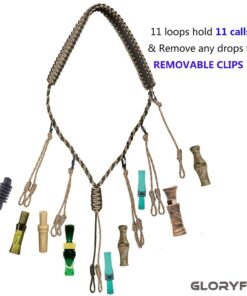 - 2. HOLDS 11 CALL SECURELY—adjustable loops that securely hold 11 calls in place.Also comes with upgraded REMOVABLE CLIPS, you can remove any unnessary loops according to your needs. Just insert your drop in the duck call groove and slide the knot down to secure your duck calls. Holds all sized calls, popular with Wood Duck Calls, Mallard Calls, Goose Calls, Teal Calls, and many others – won’t bang your calls together and protects them from drops into the water and mud.