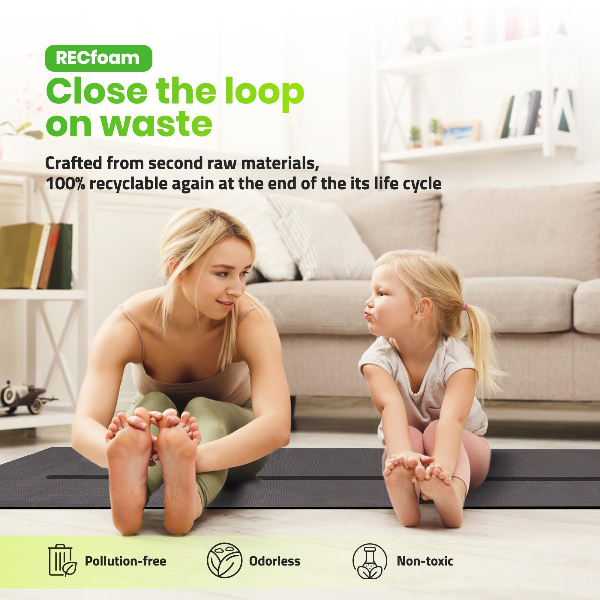 - 【Eco-friendly & Recyclable】Crafted from 100% recyclable premium Recfoam, our large exercise mat is not only durable but also kind to the environment, ensuring no harm to our planet during its lifecycle.