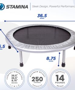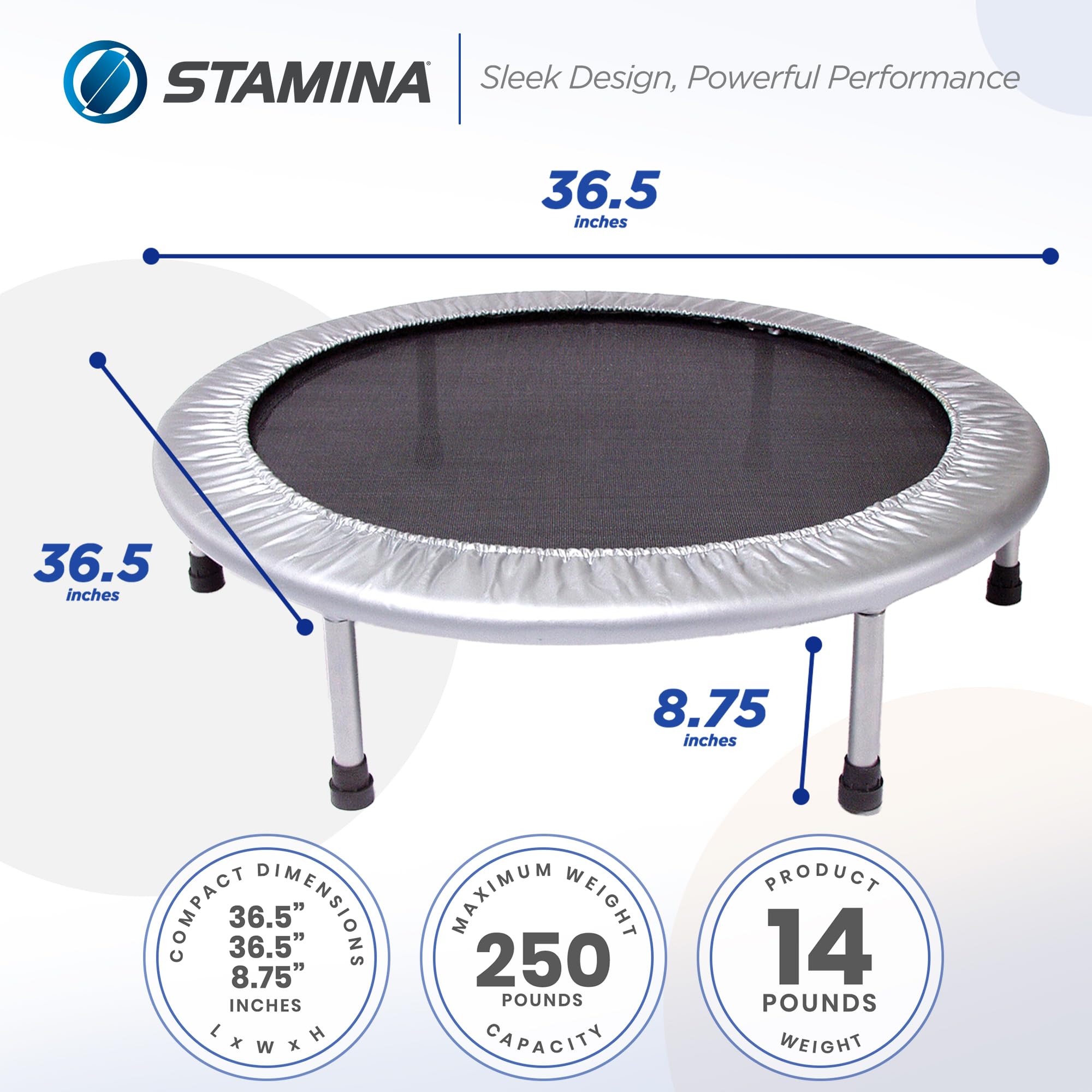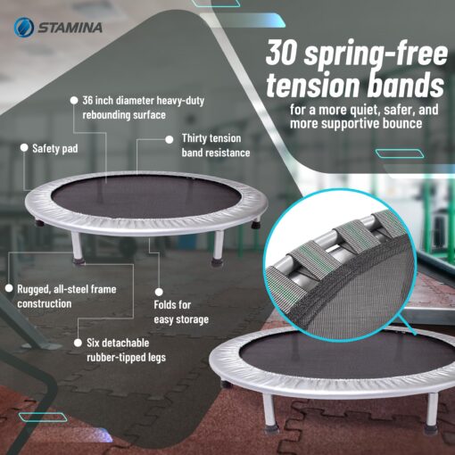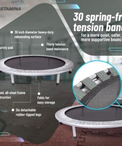 - HEAVY-DUTY TRAMPOLINE – Our Stamina 36 inch Foldable Mini Trampoline provides a fun, safe and supportive workout that helps tone your legs, abs, glutes, and back. Bounce back to health and add fun to your everyday workout with our mini trampoline.