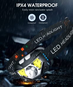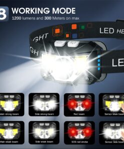 - 🏃 ✅Waterproof and 8 Modes: The headlight has IPX4 waterproof rate. The high-quality shell is more sealed and leak-proof, which is suitable for rain or snow, indoors or outdoors. The led headlamp has 8 lighting modes to meet your various needs. ①In key light mode, you can switch the main strong beam, main weak beam, side strong beam, side weak beam, red beam, SOS red strobe. ②In motion sensor mode, you can switch the main strong beam and side strong beam.