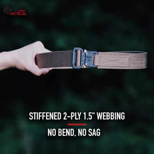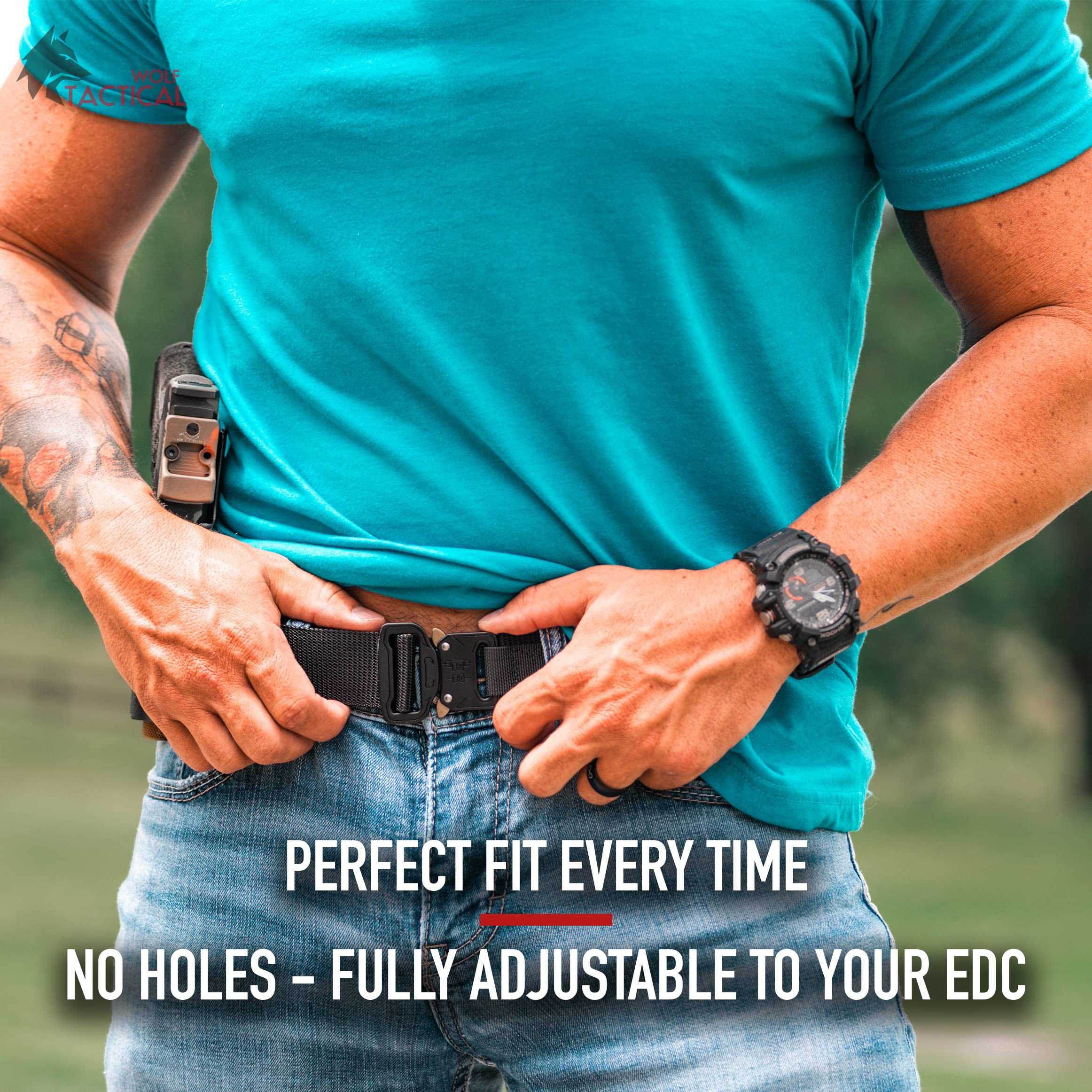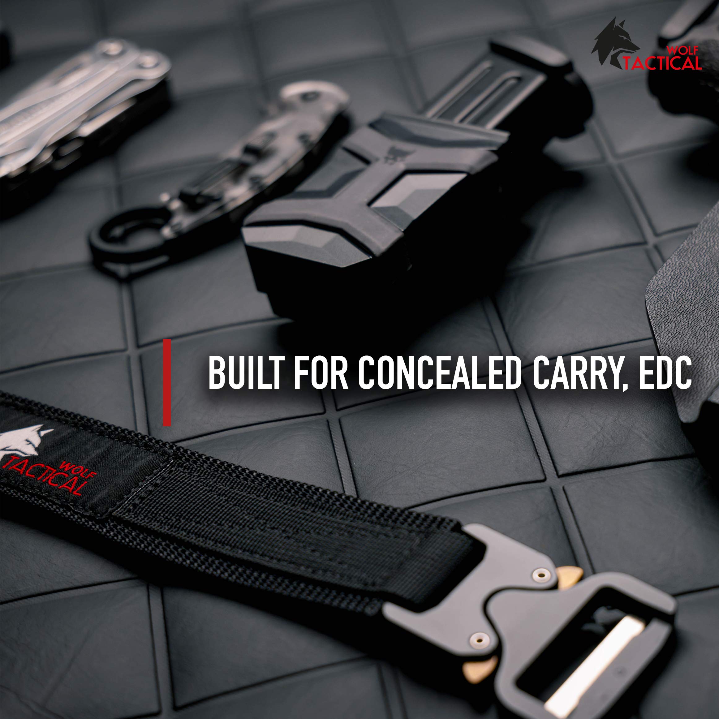 【BUILT FOR CONCEALED CARRY】★ Featuring stiffened 2-ply nylon webbing to support IWB and OWB holsters without rolling over, our EDC belt provides a safe and reliable foundation for CCW. Firmly attach your holster, mags, and pouches whether you’re at the range or carry every day. NO BEND, NO SAG.【HYBRID QUICK-RELEASE BUCKLE】★ The upgraded slim-profile hybrid buckle not only gives convenient, instant attach-detach capability, but also allows the belt to easily slide through pant loops. Velcro hook and loop secures the running end to make sure your belt stays cinched and will never slip. Our tactical belt is perfect for military, law enforcement, first responders, hunting, wilderness and outdoor survival.【PREMIUM HEAVY DUTY MATERIALS】★ Crafted with two layers of rugged, rip-resistant 1.5” nylon webbing reinforced for added rigidity, our gun belt will withstand even the most extreme conditions. Whether you use our belt for everyday carry, tactical training, or outdoor sports, Wolf Tactical ensures that you stay ready.【COMFORTABLE AND ADJUSTABLE】★ For an EDC belt, comfort and fit are king. Double-layer nylon webbing makes the perfect combination of rigidity and comfort. No holes in the belt means you can fully adjust for a custom fit according to the firearm, gear, and accessories you’re carrying.【TRUSTED WOLF TACTICAL QUALITY】★ Wolf Tactical designs mission-ready tactical gear built to last. We are based in the USA and dedicated to great customer service. Full refund if your expectations aren’t met for any reason. Feel confident with your purchase.