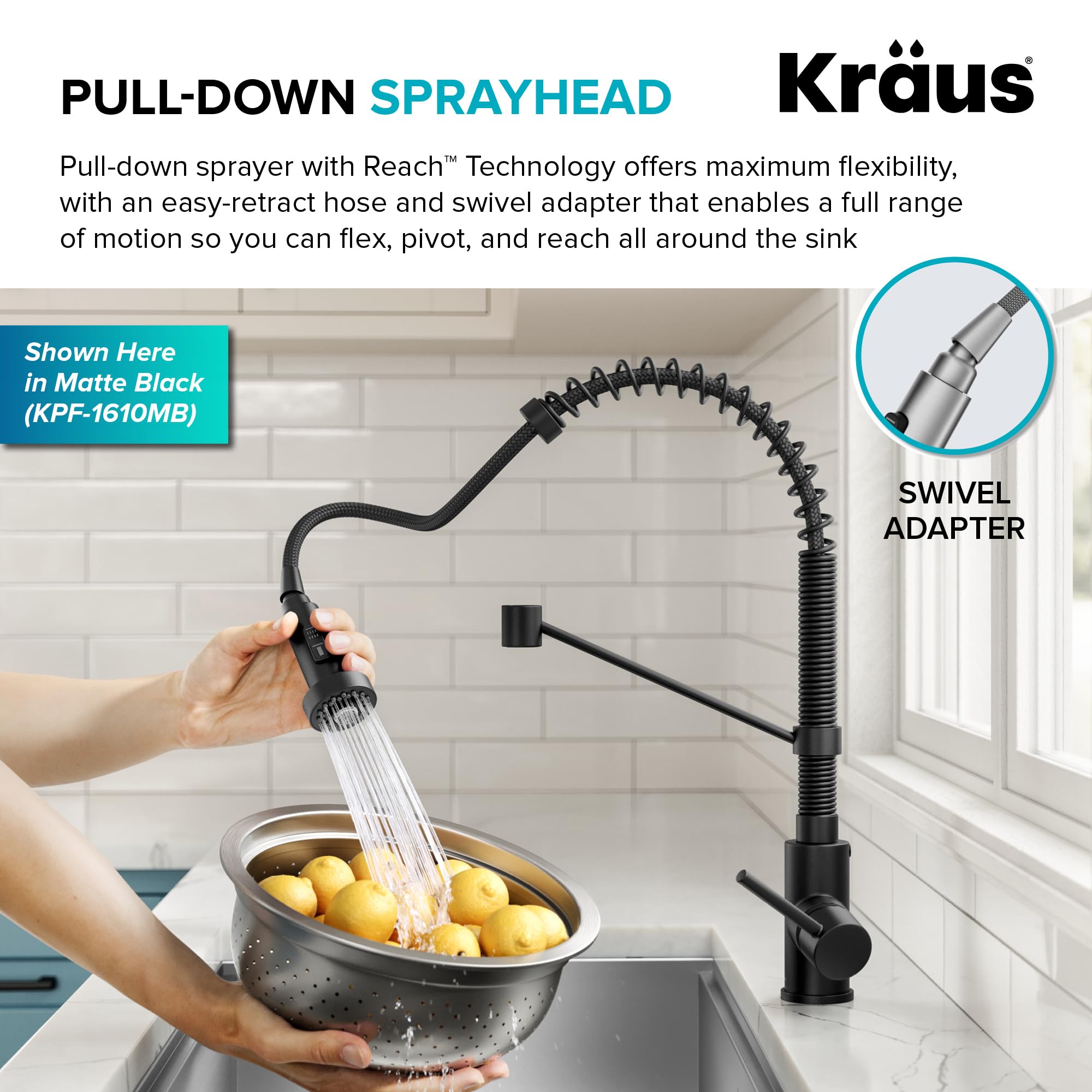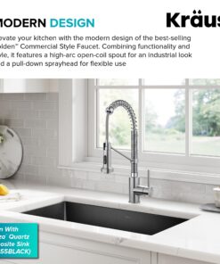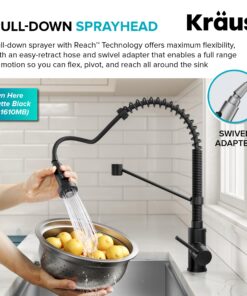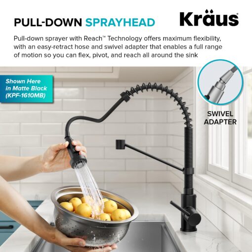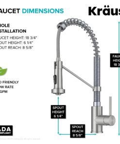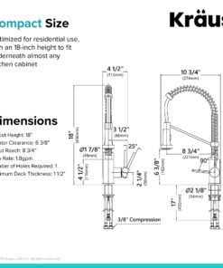 - COMMERCIAL-STYLE FAUCET is both flexible and functional, with a heavy-duty open coil spring spout for an industrial look – PERFECT FIT: Optimized for home use, compact 18-inch height fits beneath almost any kitchen cabinet – PULL-DOWN spray head offers an extended range of motion all around the sink