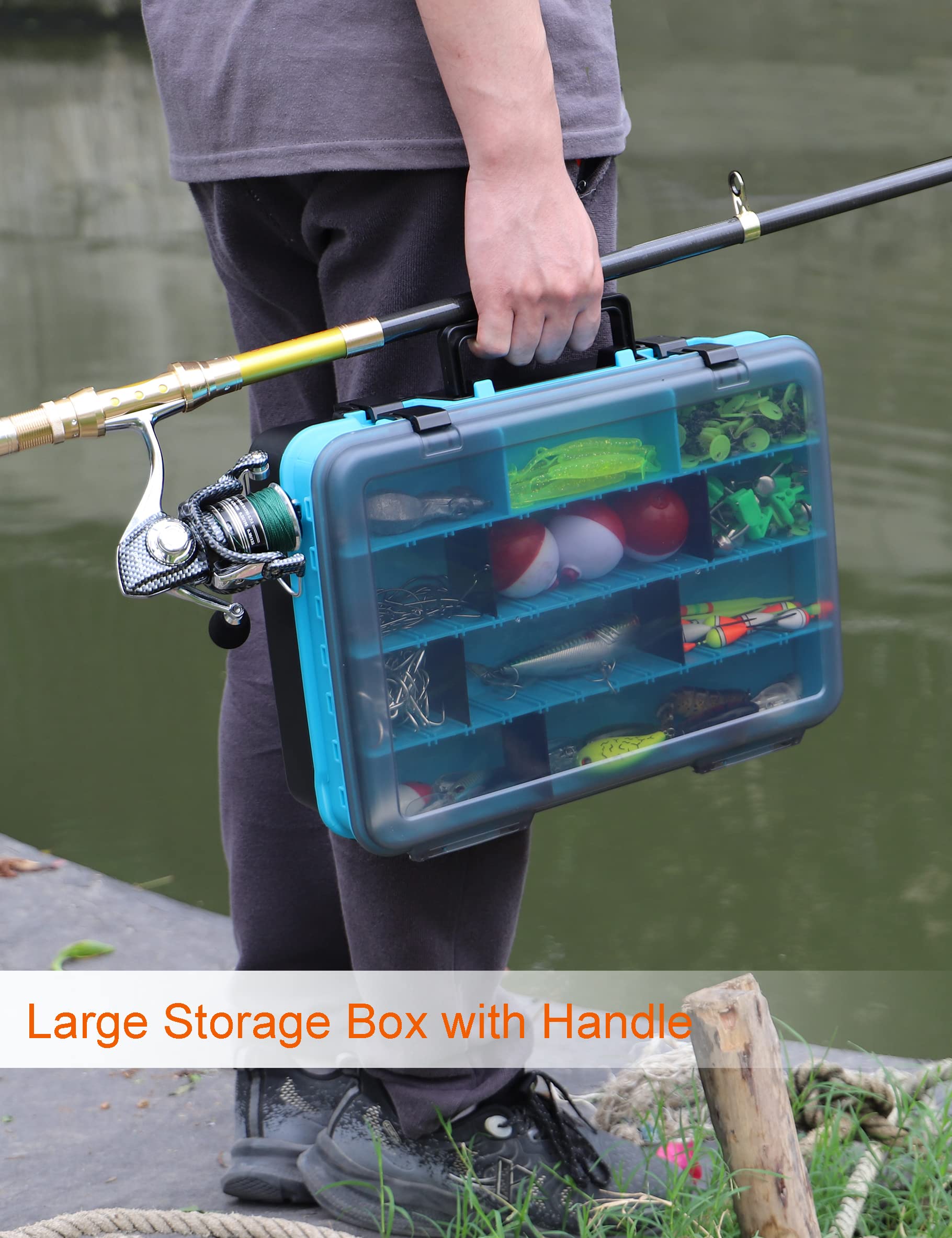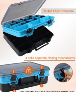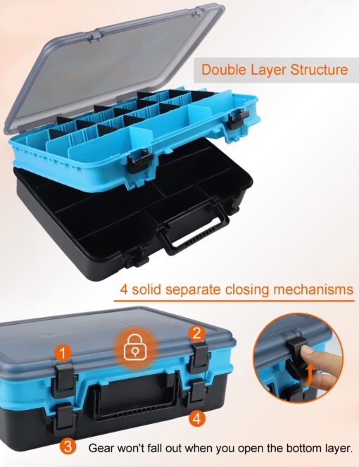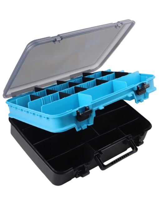- Double Layer Tackle Box: 2 sides storage box, highly configurable, can reduce the need to carry 2 boxes when camping. Perfect size for your boat, car trunk, warehouse.