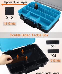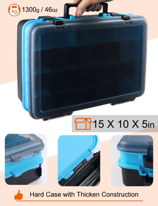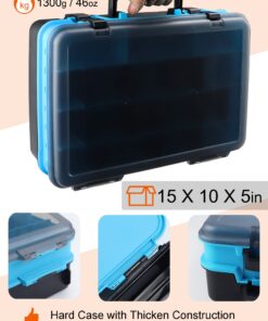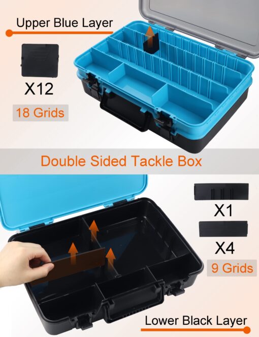- Large Fishing Tackle Box: 15 x 10 x 5inch tacklebox with double layer structure, much larger and thicker than 3700 tackle box. 12 square dividers on upper blue layer make 18 large compartments (2inch depth); 5 long dividers on lower black layer make 9 larger compartments (2.4inch depth). Plastic dividers can be taken out to expand space.