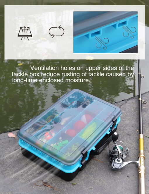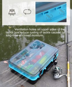 - Storage Box with Handle: Large carrying case with anti-slip handle makes it mobile and portable to carry around. Ventilation holes on upper sides of the tackle box reduce rusting of tackle caused by long-time enclosed moisture.