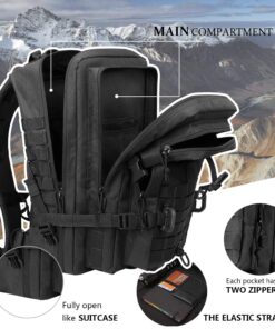- MULTI-FUNCTIONAL – This tactical assault pack have 2 main compartments, 2 small compartments in front, and a back compartment for a hydration bladder. Each of the compartments has variety pockets to help with organization. The large compartment area has an elastic strap to hold laptops or anything you don’t want to move around. Each pocket has two zipper pulls, and one of the compartments that can fully open all the way down to the bottom like suitcase.