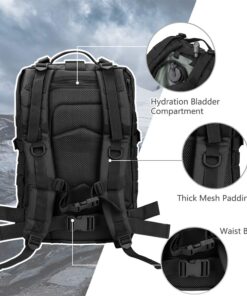 - COMFORTABLE & TOUGH – The shoulder straps are padded and adjustable and the waist belt expands enough. The thick mesh padding back area and shoulder straps will not pinch you under heavy duty. Thick padded back panel pocket works great with 3L hydration bladder(hydration bladder do not include)