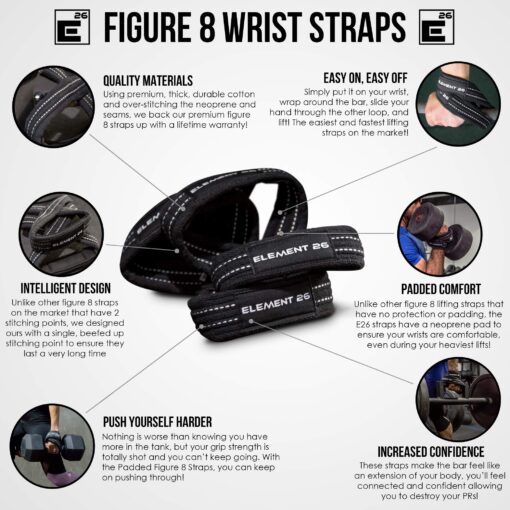 - ✅ INTELLIGENT DESIGN: Unlike other figure 8 lifting straps on the market that have 2 stitching area’s and no padded protection which is just an extra point of failure and makes them extremely uncomfortable, the Element 26 Padded Weightlifting Straps are intelligently designed by our team of experts. A single stitching point for ultimate durability and a comfortable, yet, unobtrusive pad for ultimate comfort in even your heaviest of deadlifts.