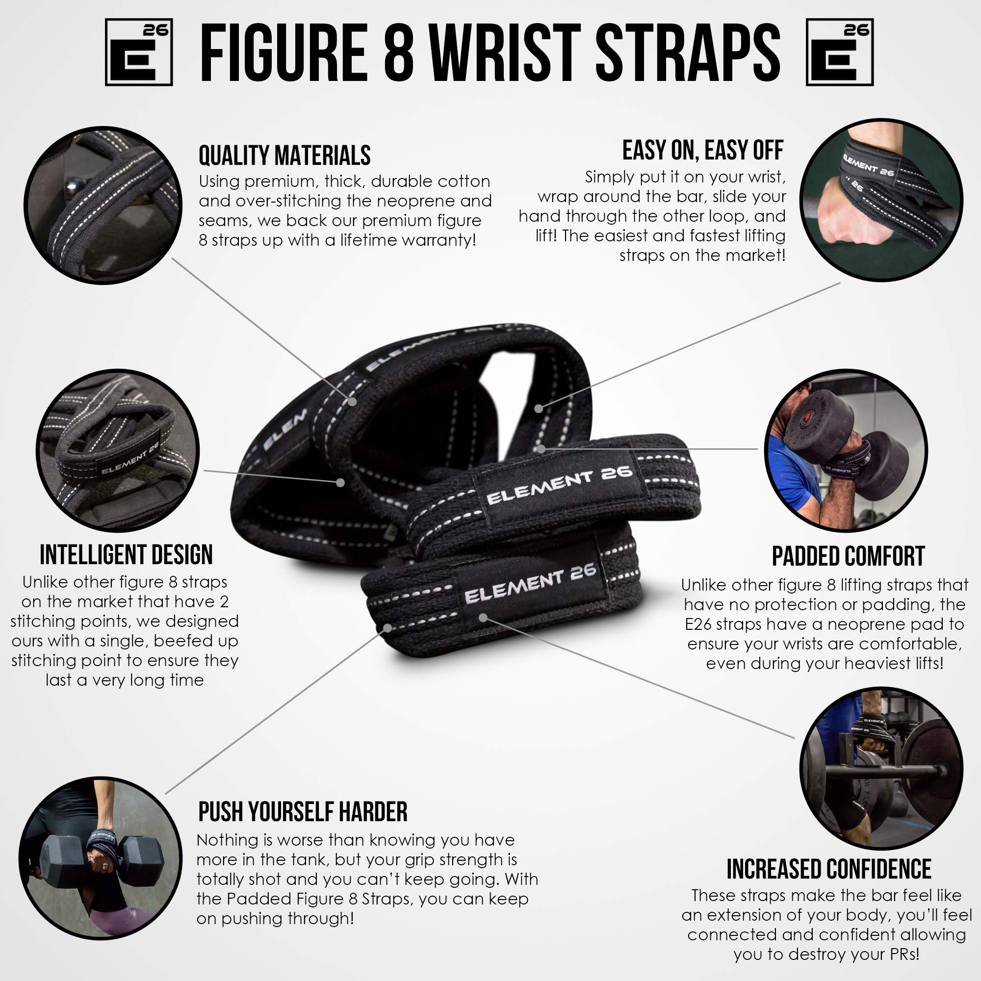 - ✅ THE ULTIMATE STRAPS: Tired of messing around with long lifting straps, looking like a fool while you twist, spin, rotate, and delay preparing for your deadlifts with your outdated, annoying, fraying, weight lifting straps? Well, at Element 26, we’re here to help. Introducing our brand new Padded Figure 8 Weightlifting straps! Quick on/off of the bar, no hassle, and the ultimate hold to destroy your prior PRs!