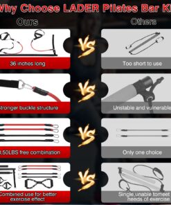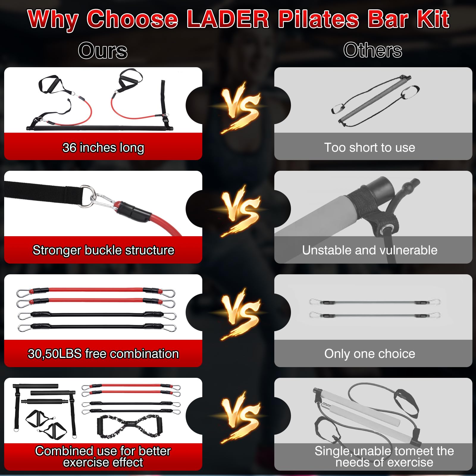 - LADER Pilates Resistance Bar Kit: Our portable Pilates bar kit includes 3 sections of high-quality steel pipe, 4 replaceable and combinable resistance bands, 2 multi-function handles, 1 8 Shape Rally Pull Rope and 1 portable bag. If you have any questions about the quality or usage, please contact us in time and we will reply to you within 24 hours. Your complete satisfaction is our ultimate goal.
