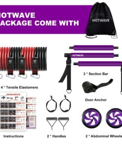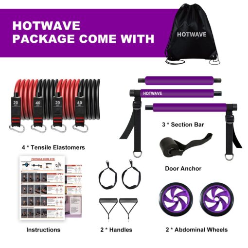 - 【Portable Gym】 With the HOTWAVE Pilates bar, you can complete more than 30 different workouts.We have three detachable bars, ab rollers, resistance bands and handles, door anchors.With the hotwave drawstring bag, you can take it to the office, the park, the gym, and the outdoors to tone your arms, chest, abs, glutes, legs, and butt. By simulating a variety of fitness equipment for professional training, squat, bench press, bend, rowing, etc