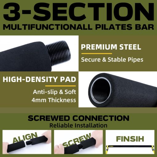 - WORKOUT IN ANYWHERE: KRIXAM portable pilates workout bar with 3-sections is quite easy to set up or disassemble. The detachable and space-saving characteristics of the Pilates exercise bar sets allow you to store them without taking up a lot of space, and exercise at home, in the office, on travel, vacation, etc.