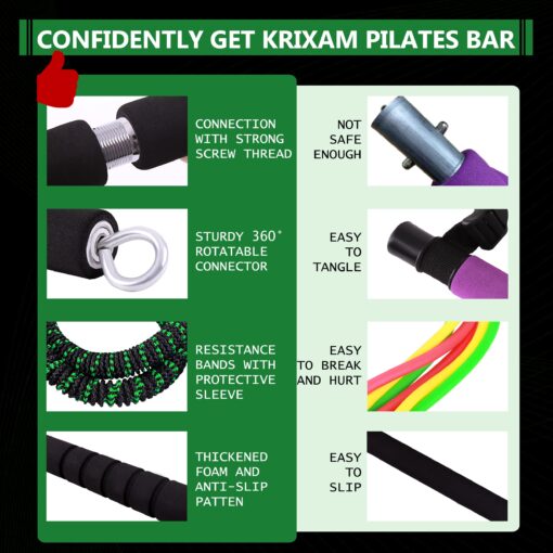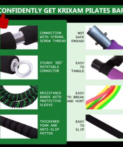 - HIGH QUALITY MATERIAL: KRIXAM Pilates bar kit is made of thickened stainless steel in order to ensure they are strong as well as break-proof, and wrapped with 5 mm thick foam to make the grip comfortable. 100% natural latex is used as the inner materials of resistance bands, and also coated with elastic textile fabric to prevent breaking and effectively prolongs the service life. Comparing with other Pilates bar kit, it is safer and more durable.