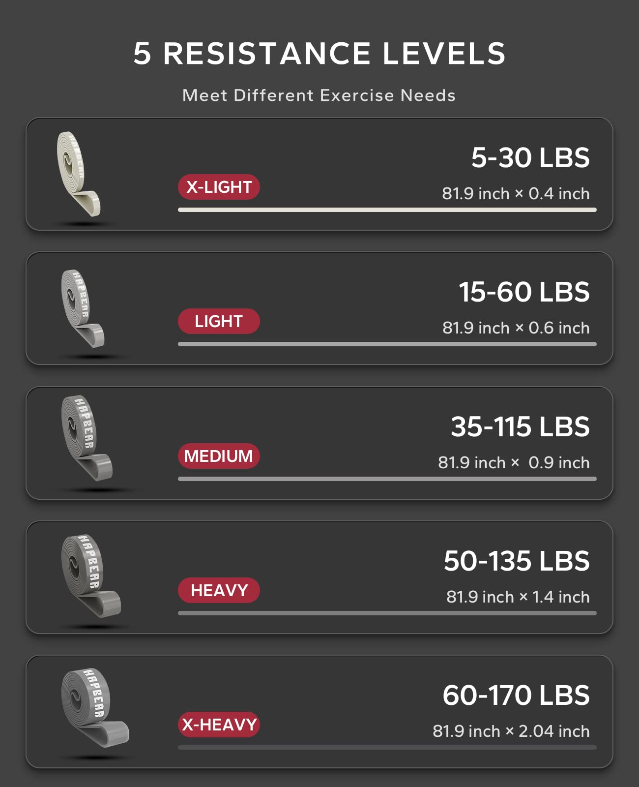 - 【5 Pcs with Varying Resistance Levels】Our pull up assistance bands comes with 5 resistance levels, which increase in layers, and you can switch combinations freely. X-LIGHT: 5-30 LBS, LIGHT: 15-60 LBS, MEDIUM: 35-110 LBS, HEAVY: 50-135 LBS, X-HEAVY: 60-170 LBS. The avant-garde and fashionable gray gradient colors will bring you a completely different experience in vision and use.