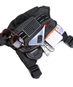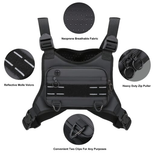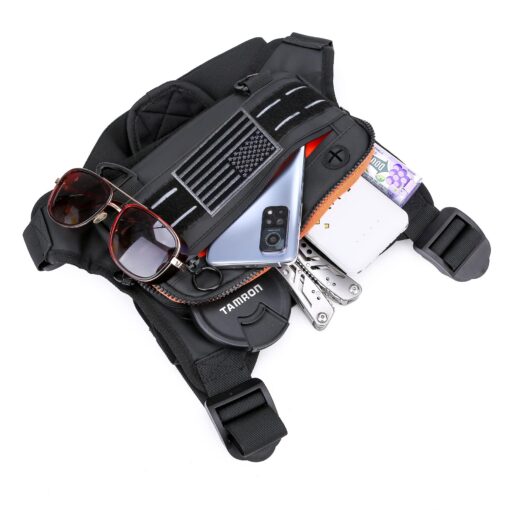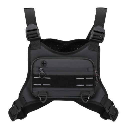 - Compact Men Chest Bags. When you put lots of accessories inside, the bag will NOT be Bloated. The Material we used for this chest pack is Water Resistant and Anti-Scratch Nylon, You will keep your item dry and safe from rainy day or sharp tools.