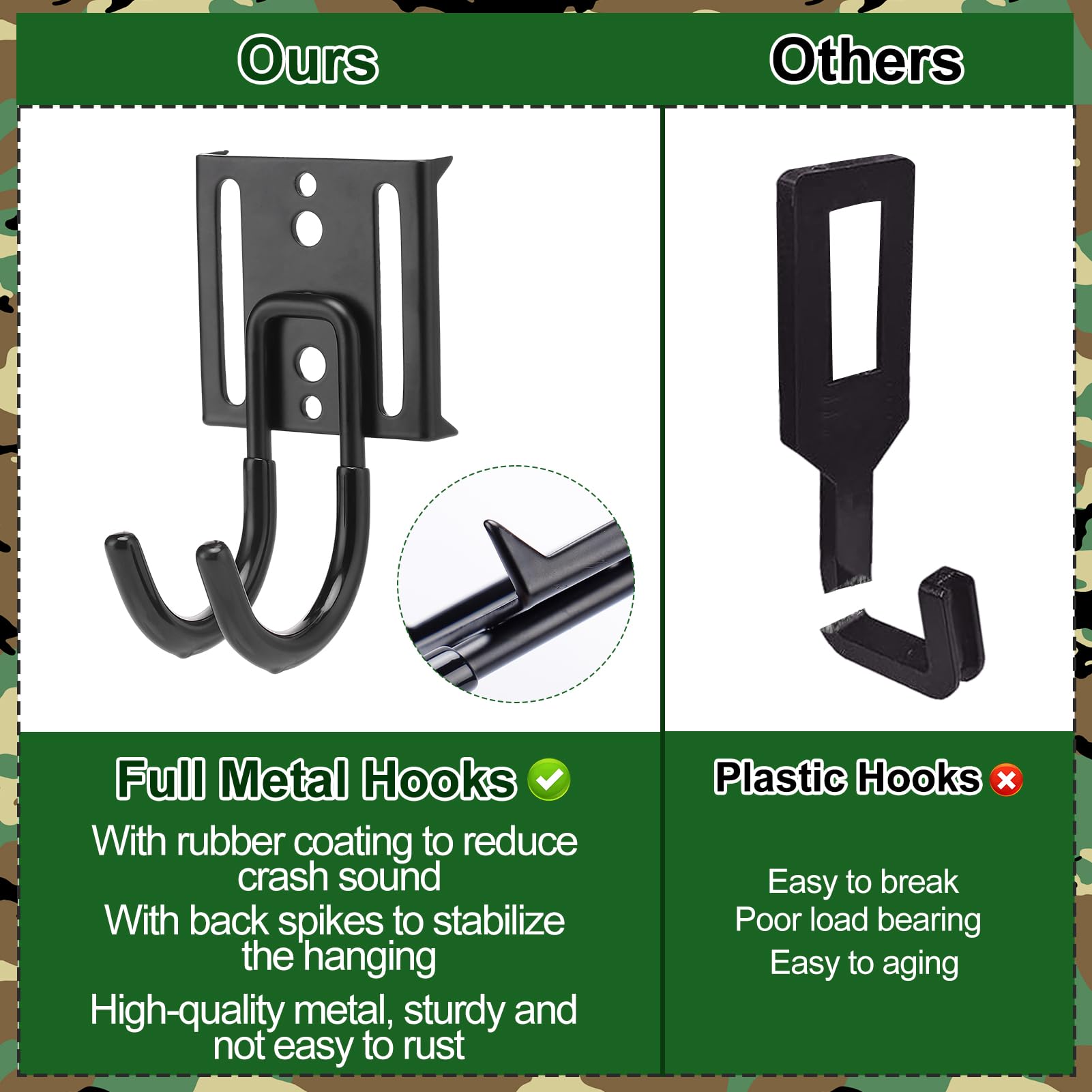 - 【Sturdy All-Metal Hooks】Our hooks feature an all-metal design, the back of the hooks are designed with sharp corners to create more friction with the surface of the tree, making them able to withstand a variety of heavy equipment and game, whether it’s a backpack, binoculars, bow and arrow, an arrow pouch, or a rangefinder. No need to worry about the hooks coming loose or slipping, allowing you to enjoy your hunting trip with more confidence.