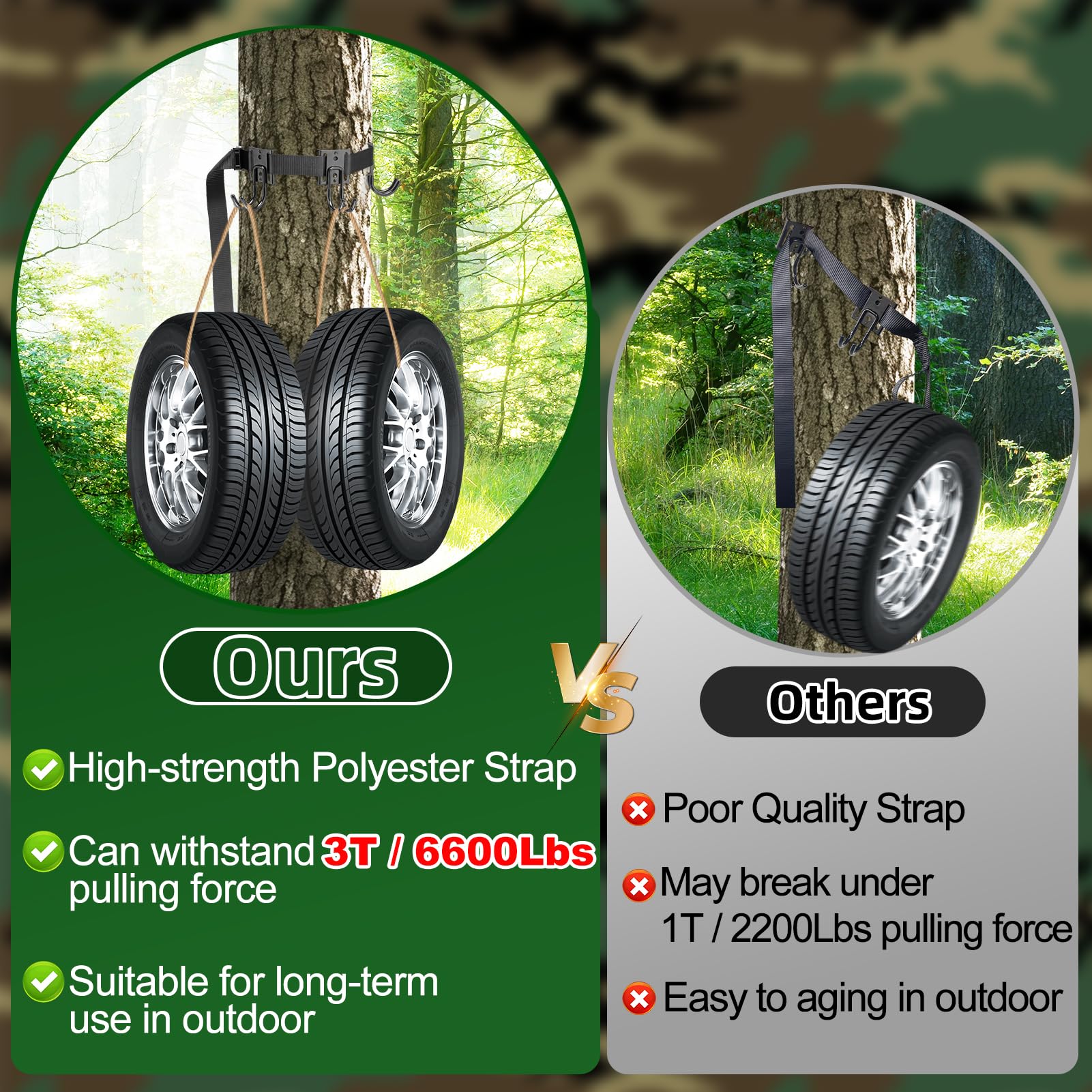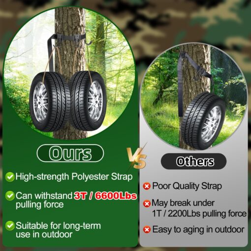 - 【6.6FT High Strength Strap】Our tree stand straps are equipped with 2M/6.6FT high-strength polyester webbing, suitable for different sizes of trees. No matter how big or small the tree is, our webbing can provide reliable support. What’s more, the high-strength polyester material is able to withstand a maximum pulling force of 3 tonnes, which makes it show excellent durability and reliability in complex environments.