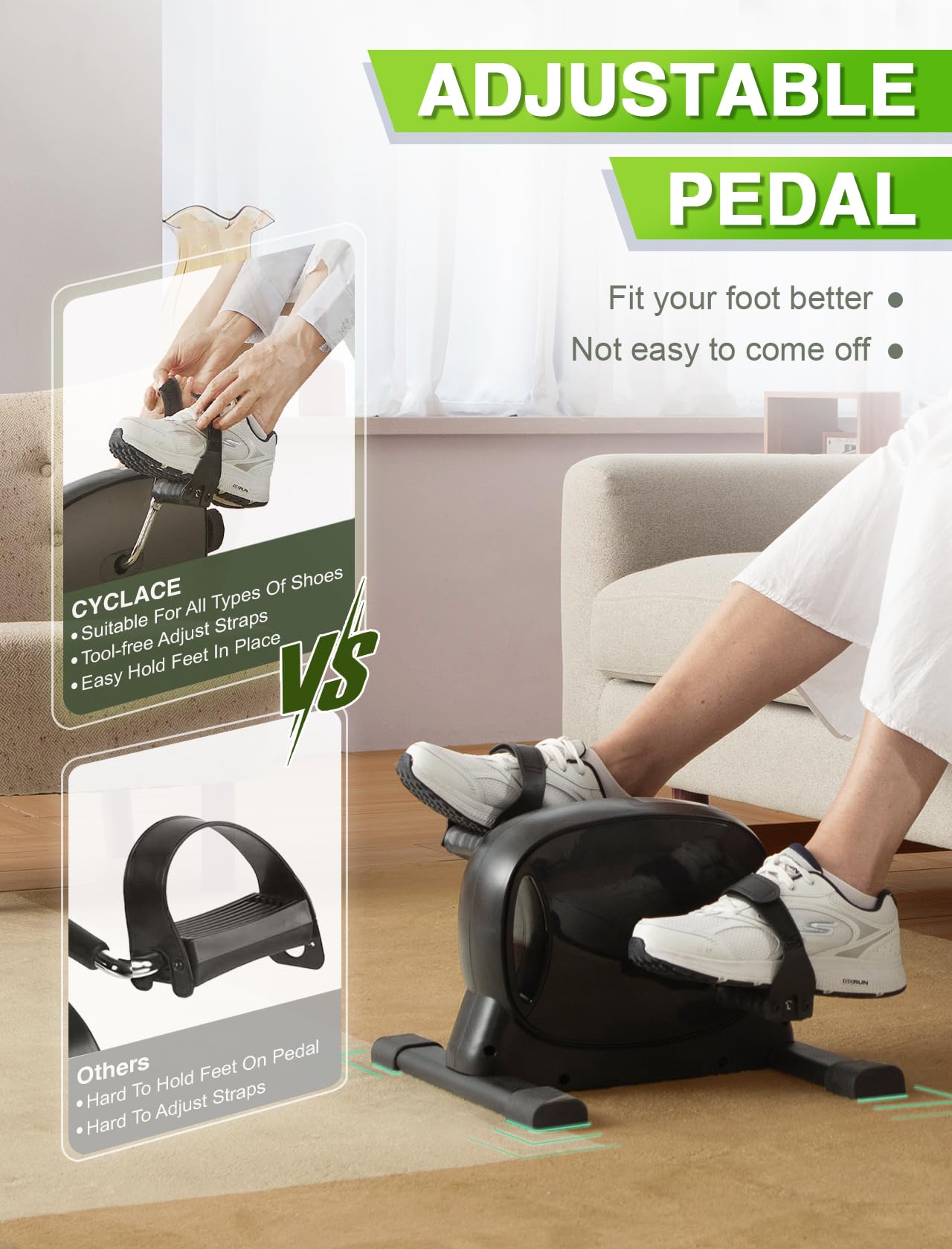 - 【Clear and Easy to Read】: Cyclace mini exerciser bik with a large 1.7*3 inch LCD screen, you can simultaneously and accurately record speed, time, count, distance, total count and calories on this oversized display. All data at a glance and no need to switch manually, and easily keep track of your workout progress. 【Better Fit for Legs】: Adjustable velcro is used on the sides of the pedals to fit all sizes of foot and palm, allowing them to fit tightly and not come off during exercise.