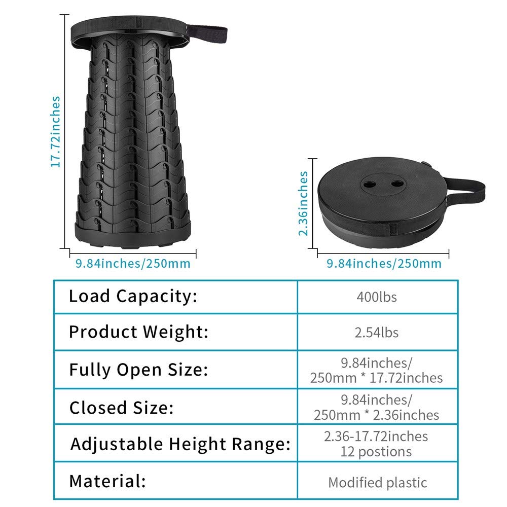 - PORTABLE & LIGHTWEIGHT: This telescopic stool is only 2.54 pounds with dimeter 9.84 inches/250mm. The adjustable strap makes the stool easy to carry in your hand or hanging on your shoulder. Perfect to use for camping, fishing, hiking, hunting, picnic, BBQ. Also can be used in living room, bedroom, bathroom etc
