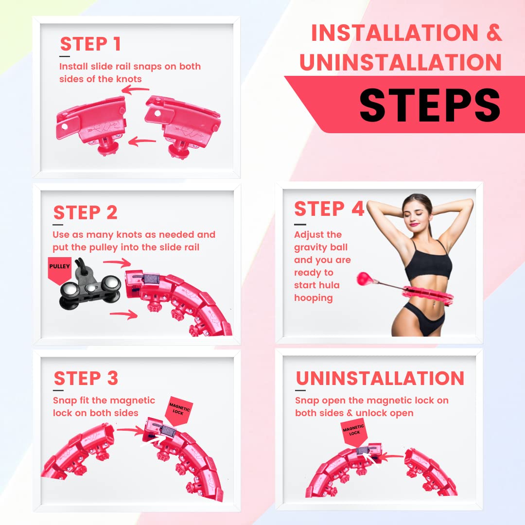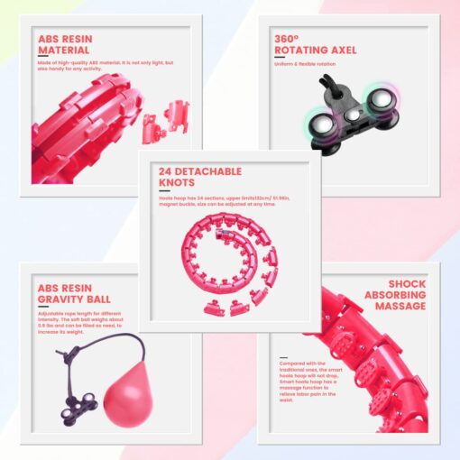 - Our smart hula hoop is made of hard ABS plastic to prevent equipment from aging, consisting of 24 detachable parts with a simple push of a button which gives you adjustable size facility, it’s 360-degree shock-absorbing