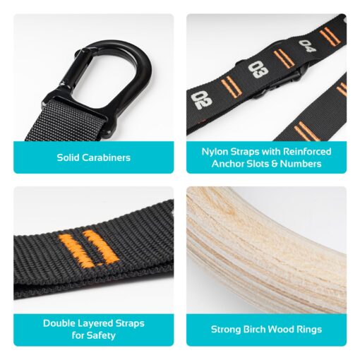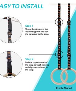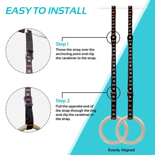 - [Easier and Safer Installation] While regular gym rings require complicated and precise steps for buckle installation to ensure the safe use, VULKEN gym rings allow for fast and secure set-up by simply clipping the carabiners to the numbered loops on both straps.