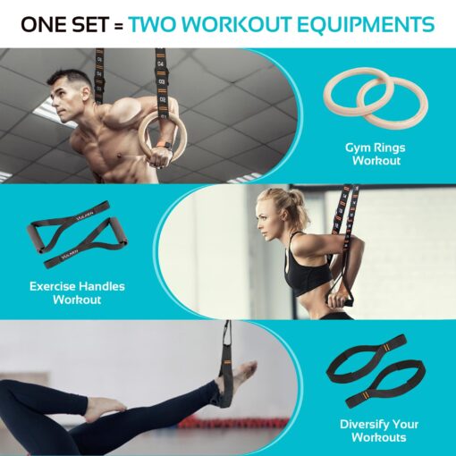 - [More Attaching Options] VULKEN gymnastics rings set includes a door attachment that allows our fitness rings to attach to a solid door. This fitness accessory turns any room with a solid door into your flexible gym! VULKEN wooden gym rings kit is the ideal fitness tool to workout at home, in the gym, hotel, indoors or outdoors etc.